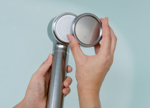 Dual filtration system (in handle and head) to remove 99.9% of chlorine and heavy metals in shower water.